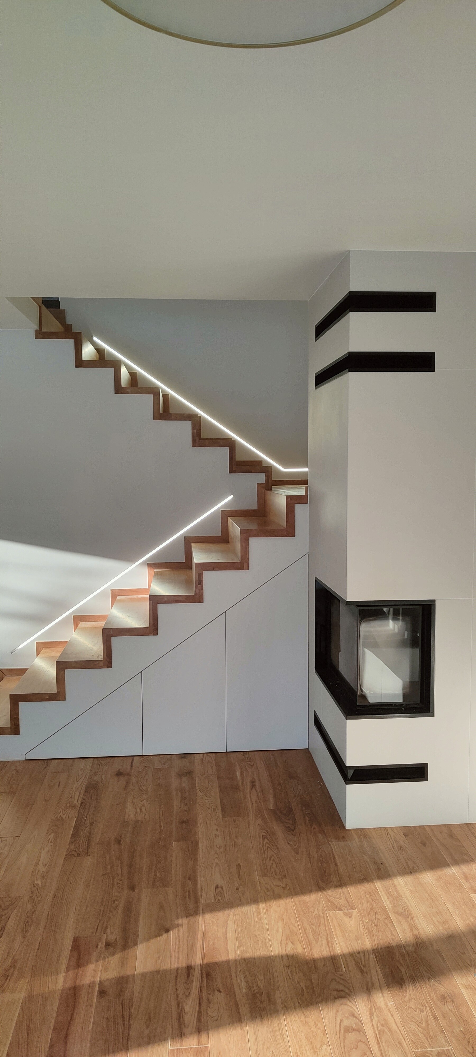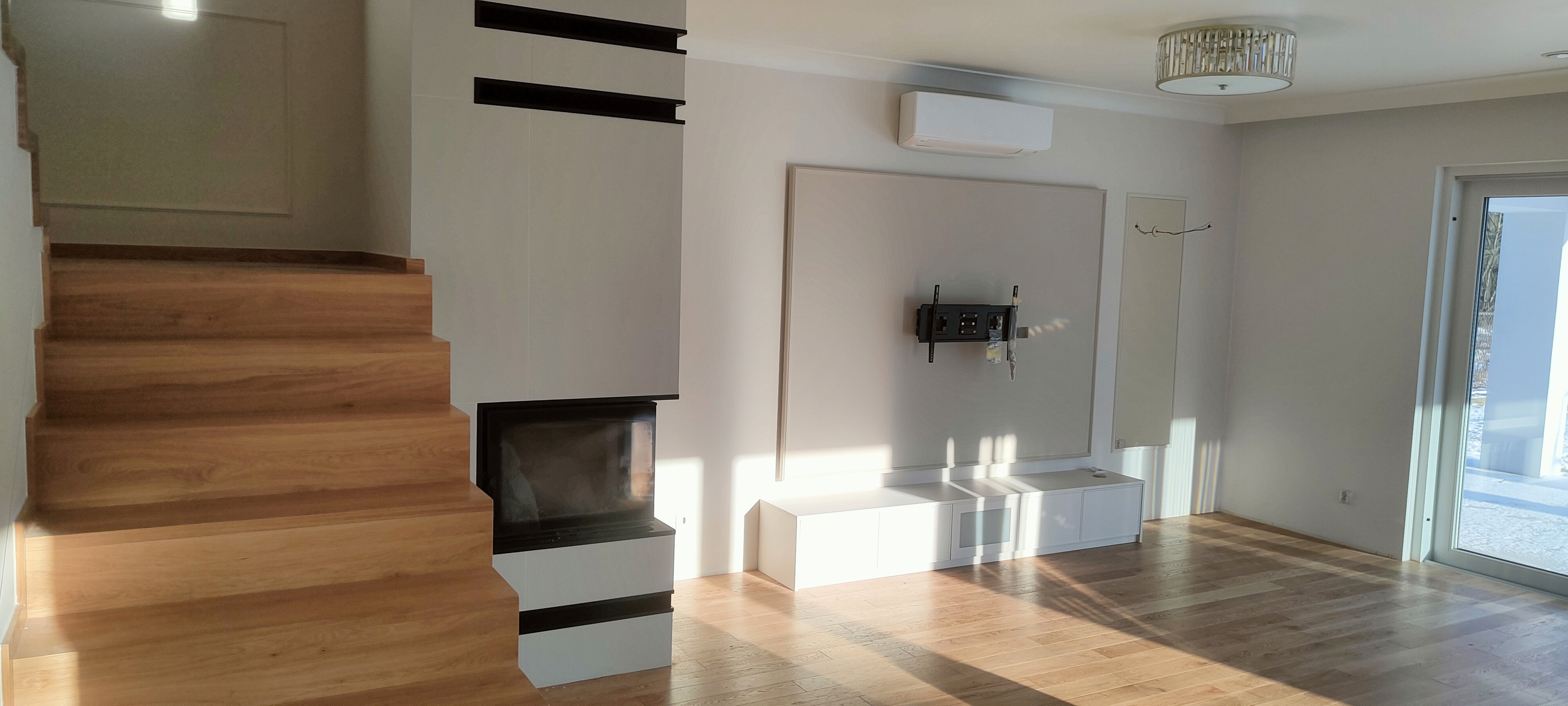 Dużym wyzwaniem była również strefa piętra – brak stropu wymagał zaprojektowania i wykonania podwieszanego sufitu, uwzględniającego wypusty pod anemostaty (rekuperacja) oraz właz strychowy, z zachowaniem pełnej funkcjonalności i estetyki. Realizacja była możliwa dzięki zaangażowaniu wyspecjalizowanych ekip oraz precyzyjnej koordynacji wszystkich etapów prac.