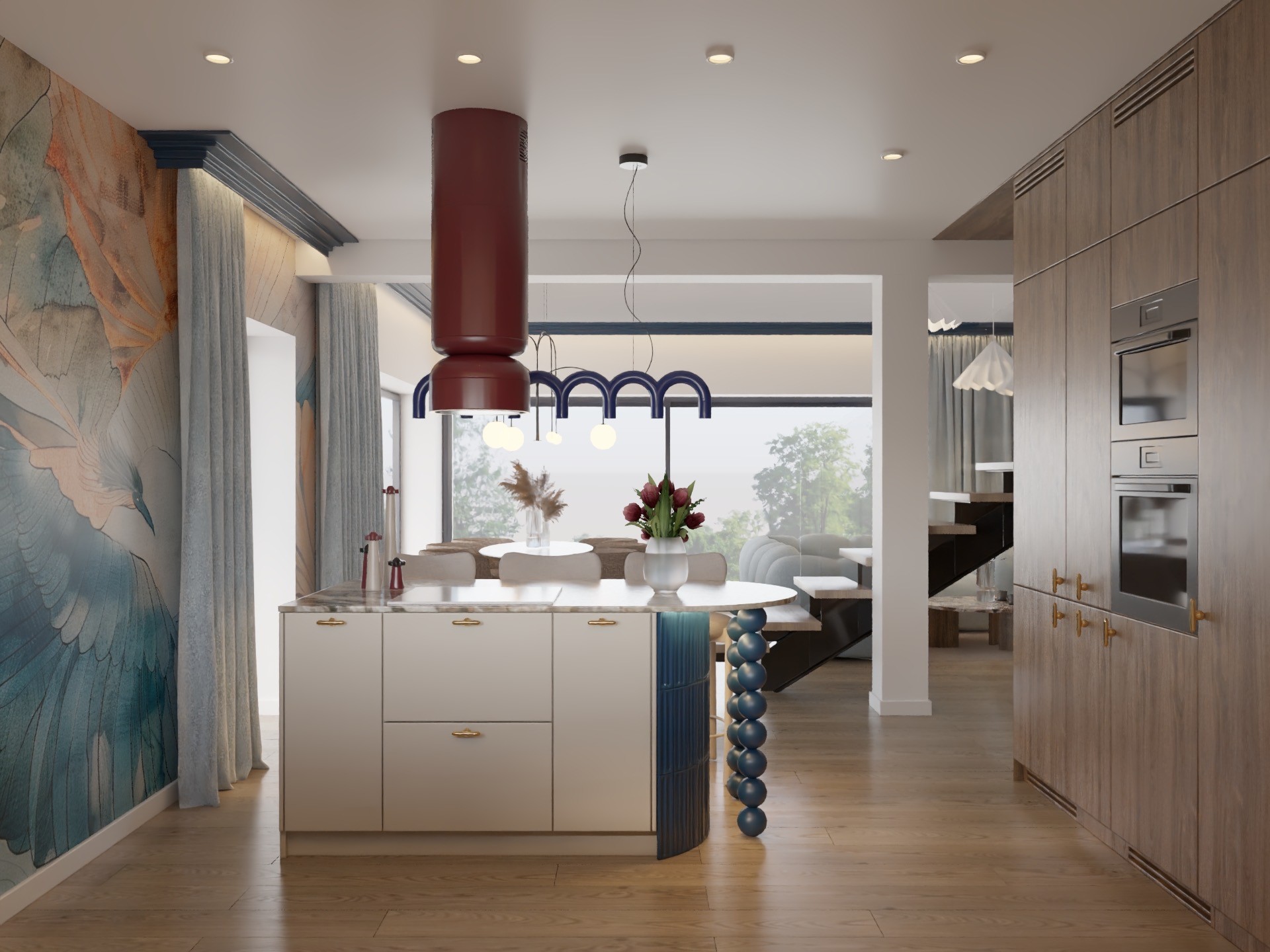 Optymalizacja układu pozwoliła również zyskać dodatkową przestrzeń na parterze – powstał gabinet, który zwiększył funkcjonalność domu. W aranżacji postawiono na odważne rozwiązania stylistyczne – liczne tapety, wyraziste akcenty oraz ukryte zabudowy stolarskie, które łączą estetykę z praktycznym wykorzystaniem przestrzeni.