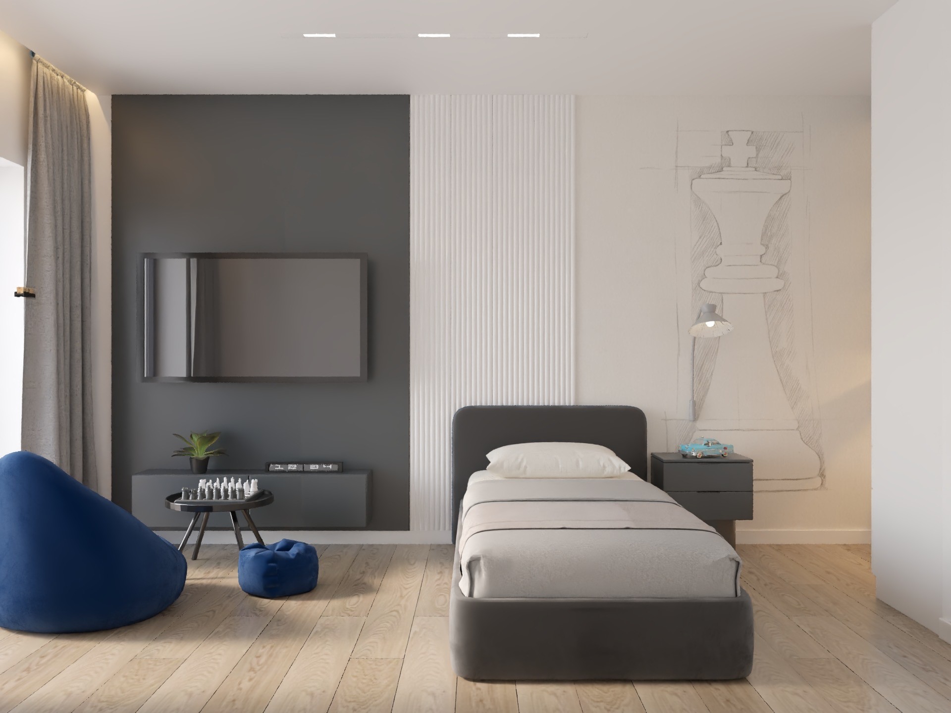Projekt obejmował zarówno koncepcję, jak i kompleksową realizację, z naciskiem na maksymalne wykorzystanie potencjału przestrzeni. Największym wyzwaniem było zagospodarowanie poddasza – tak, aby stworzyć komfortową, prywatną strefę dla właścicieli.