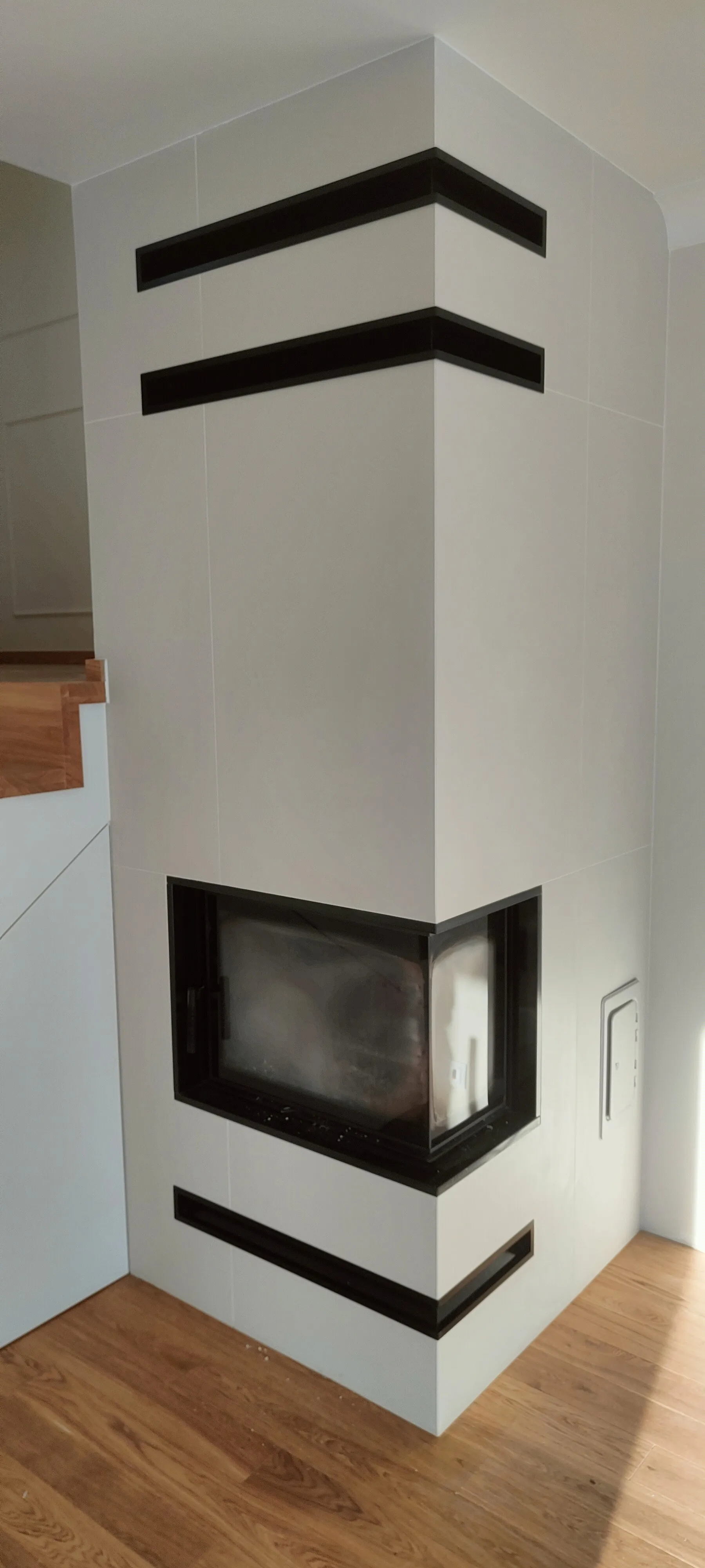 Centralnym elementem strefy dziennej stała się zabudowa kominka w gresie, wpisująca się w elegancki styl całego domu. Dwie łazienki wykończono w całości gresem, dbając o spójność estetyczną i trwałość materiałów.