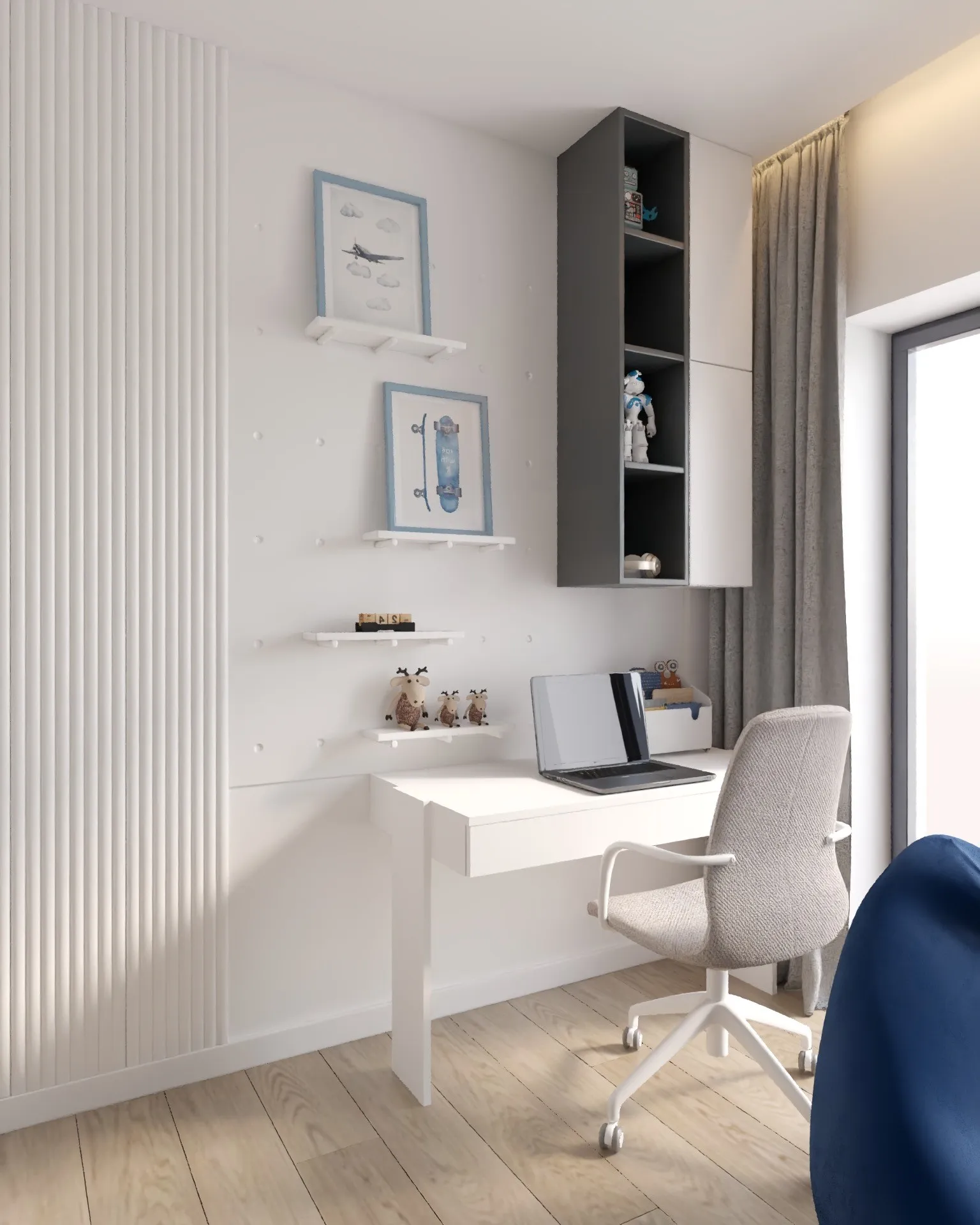 Projekt obejmował zarówno koncepcję, jak i kompleksową realizację, z naciskiem na maksymalne wykorzystanie potencjału przestrzeni. Największym wyzwaniem było zagospodarowanie poddasza – tak, aby stworzyć komfortową, prywatną strefę dla właścicieli.