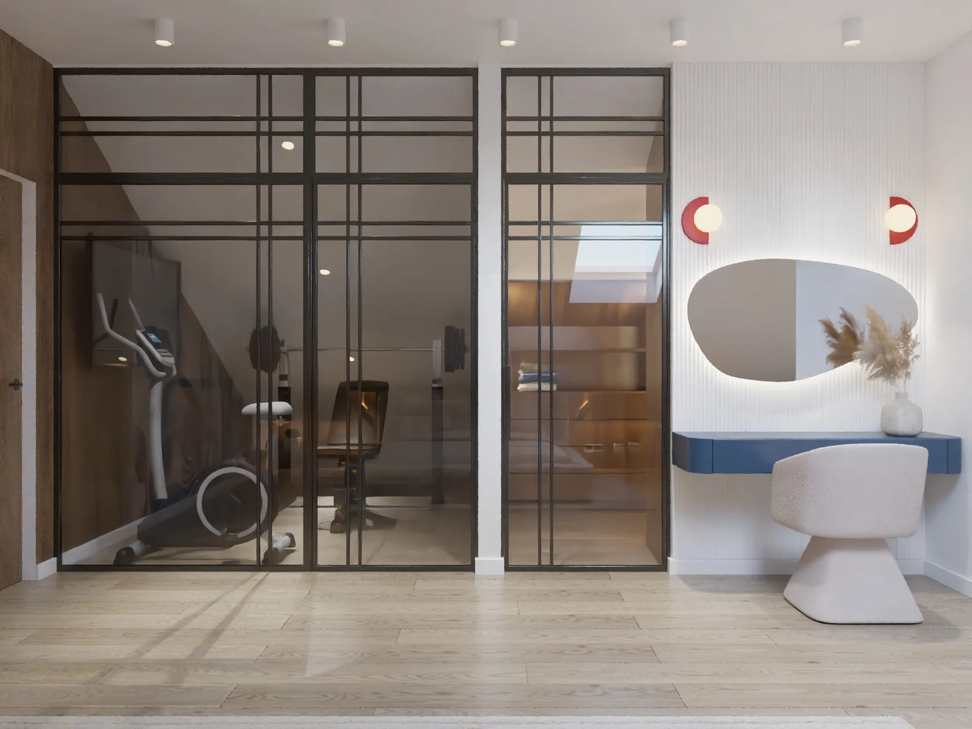 Dzięki przemyślanemu podziałowi udało się zaplanować sypialnię z łazienką, a dodatkowo wygospodarować miejsce na garderobę, siłownię oraz saunę – funkcje, które znacząco podnoszą komfort codziennego życia.